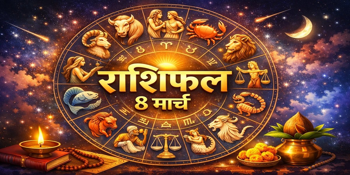 Aaj Ka Rashifal 8 March 2026: 8 मार्च 2026, रविवार को चैत्र कृष्ण पक्ष की पंचमी तिथि है। आज दोपहर 1:32 बजे तक स्वाती नक्षत्र रहेगा और उसके बाद विशाखा नक्षत्र आरंभ होगा। इसके साथ ही आज रंग पंचमी का पर्व भी मनाया जा रहा है। ग्रह-नक्षत्रों की स्थिति सभी 12 राशियों के जीवन पर अलग-अलग प्रभाव डाल सकती है।