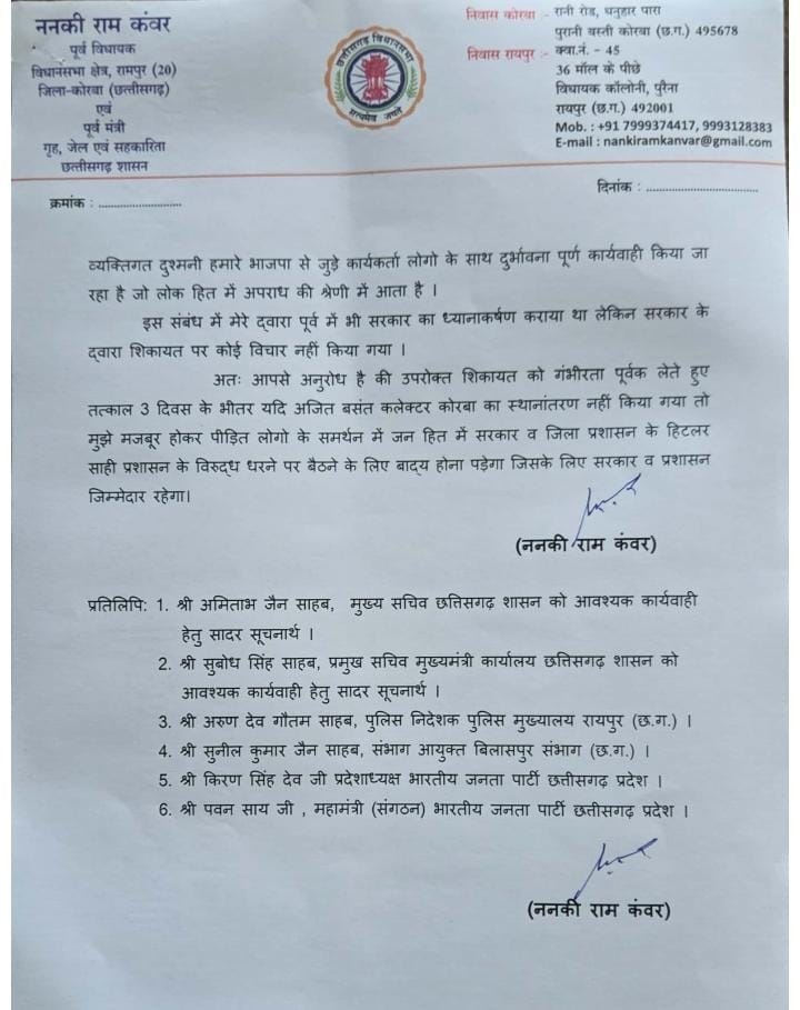 कोरबा : पूर्व गृहमंत्री ननकीराम कंवर ने प्रदेश सरकार और भाजपा संगठन को नोटिस भेजकर कलेक्टर अजित वसंत को कोरबा से हटाने की मांग की है। उनका आरोप है कि कलेक्टर हिटलर प्रशासक की तरह काम कर रहे हैं और उनके खिलाफ सैकड़ों भ्रष्टाचार के मामले हैं। ननकीराम कंवर ने कहा कि अगर कलेक्टर को नहीं हटाया गया तो वे शासन-प्रशासन के खिलाफ धरने पर बैठेंगे।