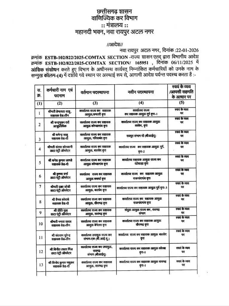 रायपुर : राज्य शासन के वाणिज्यिक कर विभाग ने विभागीय स्तर पर बड़ा प्रशासनिक फेरबदल करते हुए 21 कर्मचारियों का तबादला आदेश जारी किया है। यह आदेश महानदी भवन से जारी किया गया है। जारी आदेश के अनुसार, सहायक ग्रेड-दो, सहायक ग्रेड-तीन, डाटा एंट्री ऑपरेटर, आशुलिपिक एवं वाहन चालक सहित कुल 21 अधिकारियों-कर्मचारियों को अस्थायी रूप से, आगामी आदेश तक नई पदस्थापना दी गई है। इनमें अधिकांश स्थानांतरण स्वयं के व्यय पर किए गए है।