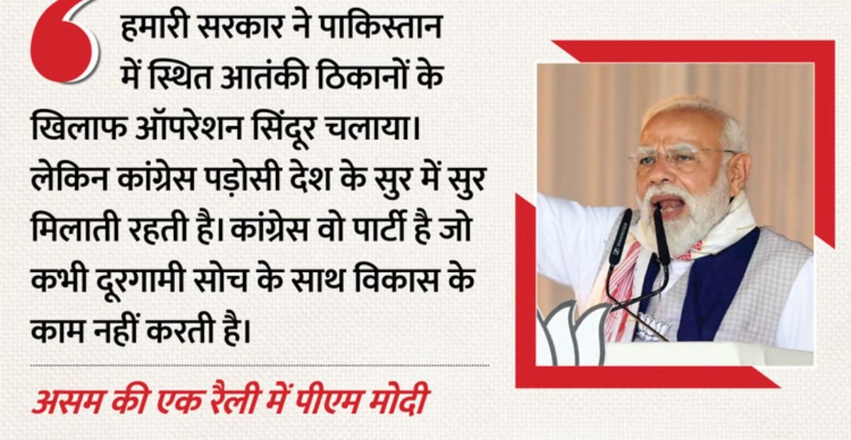 असम चुनावी रैली में प्रधानमंत्री Narendra Modi ने विपक्ष पर तीखा हमला बोला। उन्होंने कहा कि Indian National Congress देश के हितों के बजाय वही भाषा बोल रही है जो Pakistan चाहता है। पीएम मोदी ने अपने संबोधन में ‘ऑपरेशन सिंदूर’ का जिक्र करते हुए राष्ट्रीय सुरक्षा और आतंकवाद के मुद्दे पर विपक्ष को घेरा।